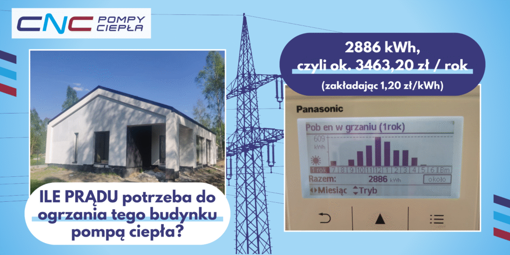 Na podstawie naszego przykładu z Grodziska Mazowieckiego, nowy dom o powierzchni 133 m² ogrzewany pompą ciepła Panasonic zużywa rocznie ok. 2886 kWh prądu, co daje koszt od 2900 do 3500 zł rocznie.